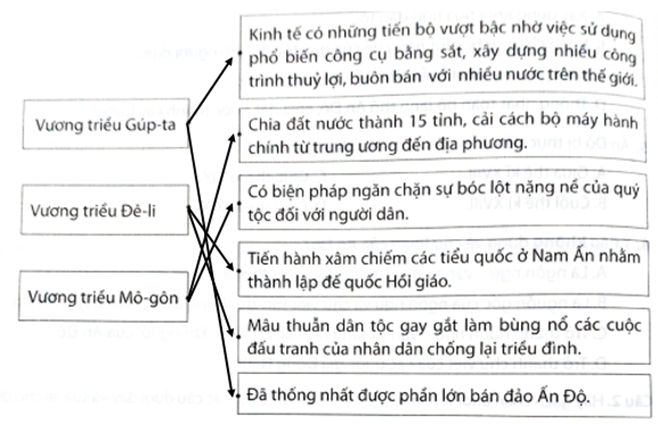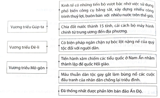 Câu 3 trang 20 vở thực hành Lịch sử 7: Hãy nối ô chữ bên trái với ô chữ bên phải sao cho phù hợp về lịch sử Ấn Độ thời trung đại.